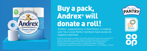 Through a joint campaign with Co-op Members and Andrex / Kimberley Clark and In Kind Direct, Pantry members have access to top quality hygiene essentials.